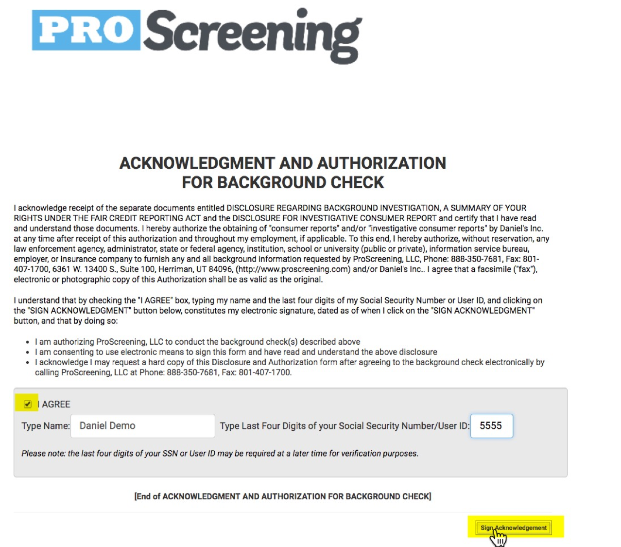 Applicant gives permission via electronic signature for us to perform the Background Check.
